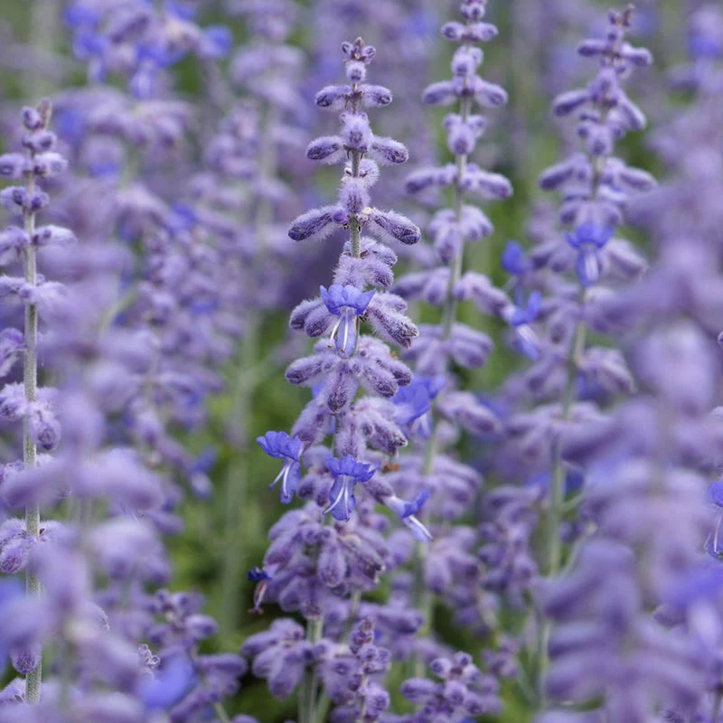 18-24" tall x 24-36" wide. At last, the first truly short growing selection of Russian Sage, 'Lacey Blue' is half the height of 'Blue Spires' and fits into small spaces. With exceptionally large flower spikes, Perovskia atriplicifolia Lacy Blue is deer resistant, long blooming (from mid-summer through the fall), and thrives in any soil. Just grow it hot and dry once established. Most soil types including clay. Cut back entire plant back to 12” - 15” in spring (not in the fall) Good for Firescaping. Plant with Agastache, Achillea, Penstemon.