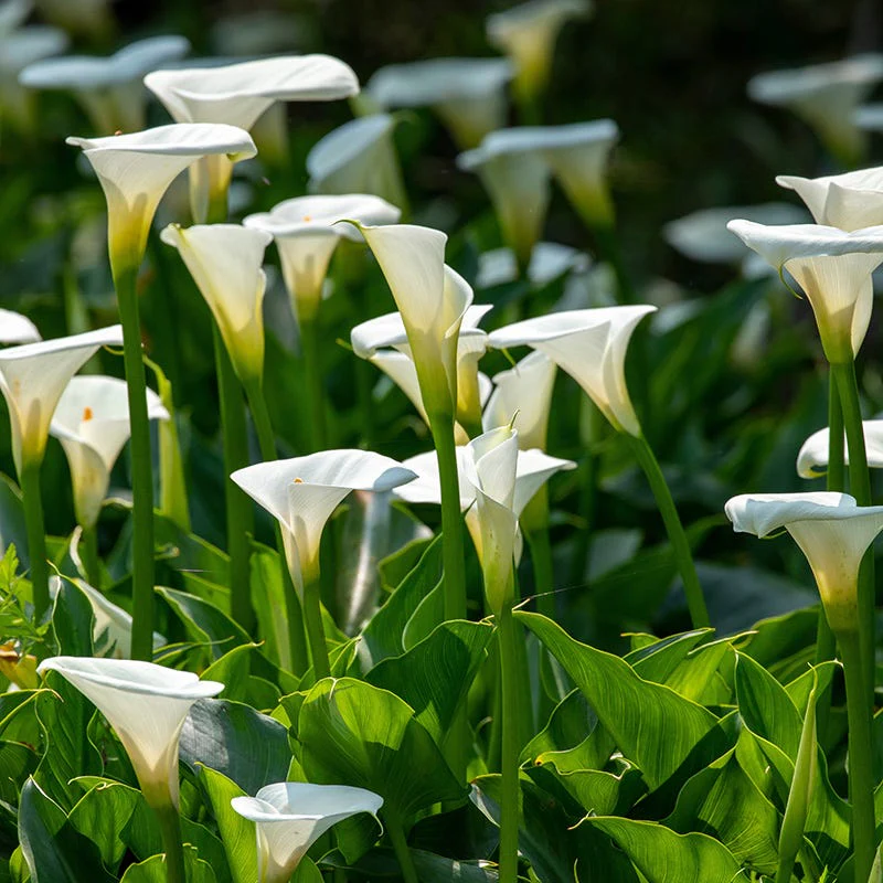 ‘Snowboard’ Calla Lilies feature classic, elegant white blooms that Callas are famous for. They’ll make exquisite floral arrangements and striking additions to perennial and container gardens. Calla Lily bulbs are easy-to-grow and will result in elegant blooms in just over two months. Callas are also favored for their foliage, which is lush with glossy, heart-shaped or pointed leaves, often flecked with white spots.